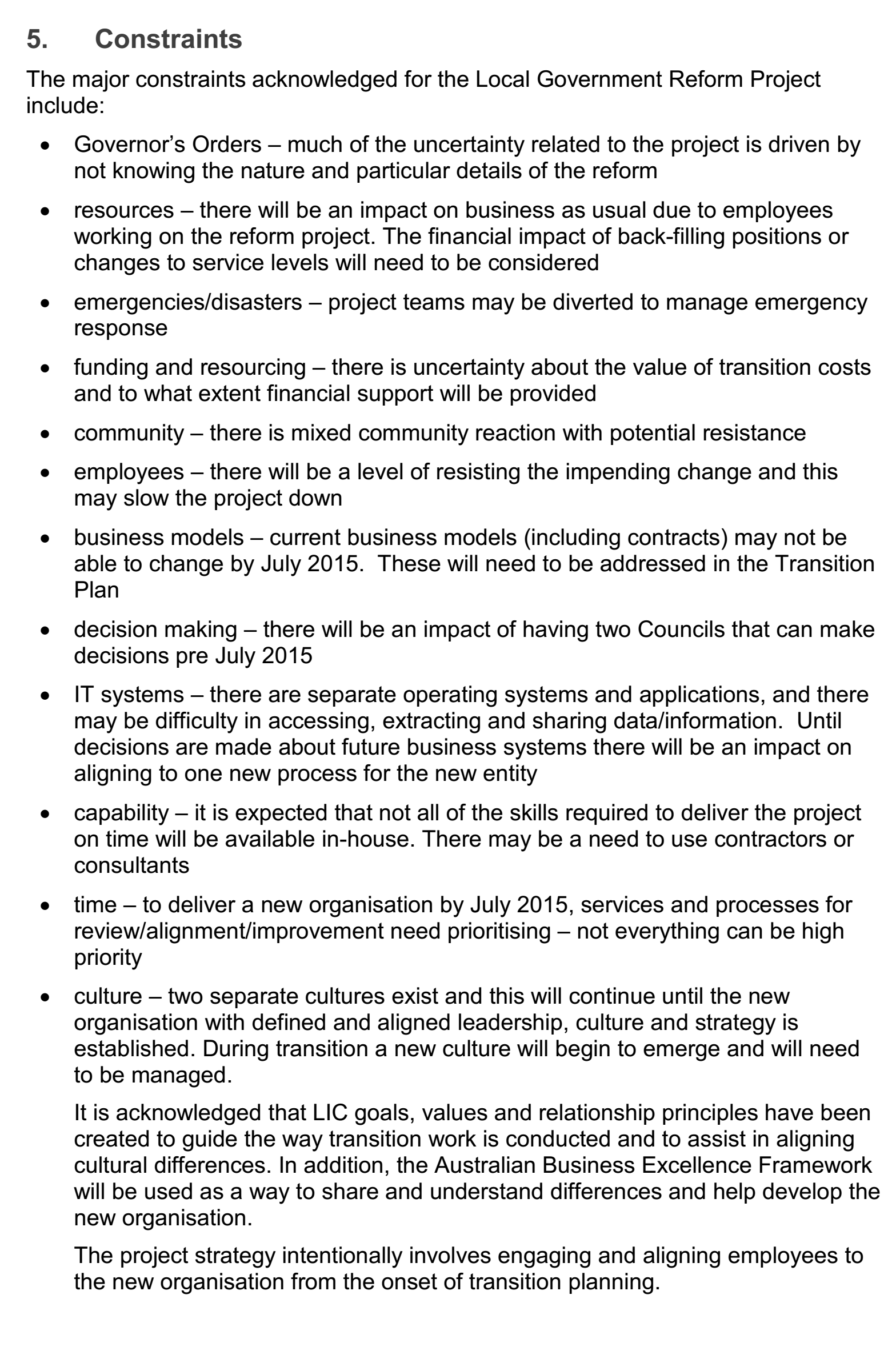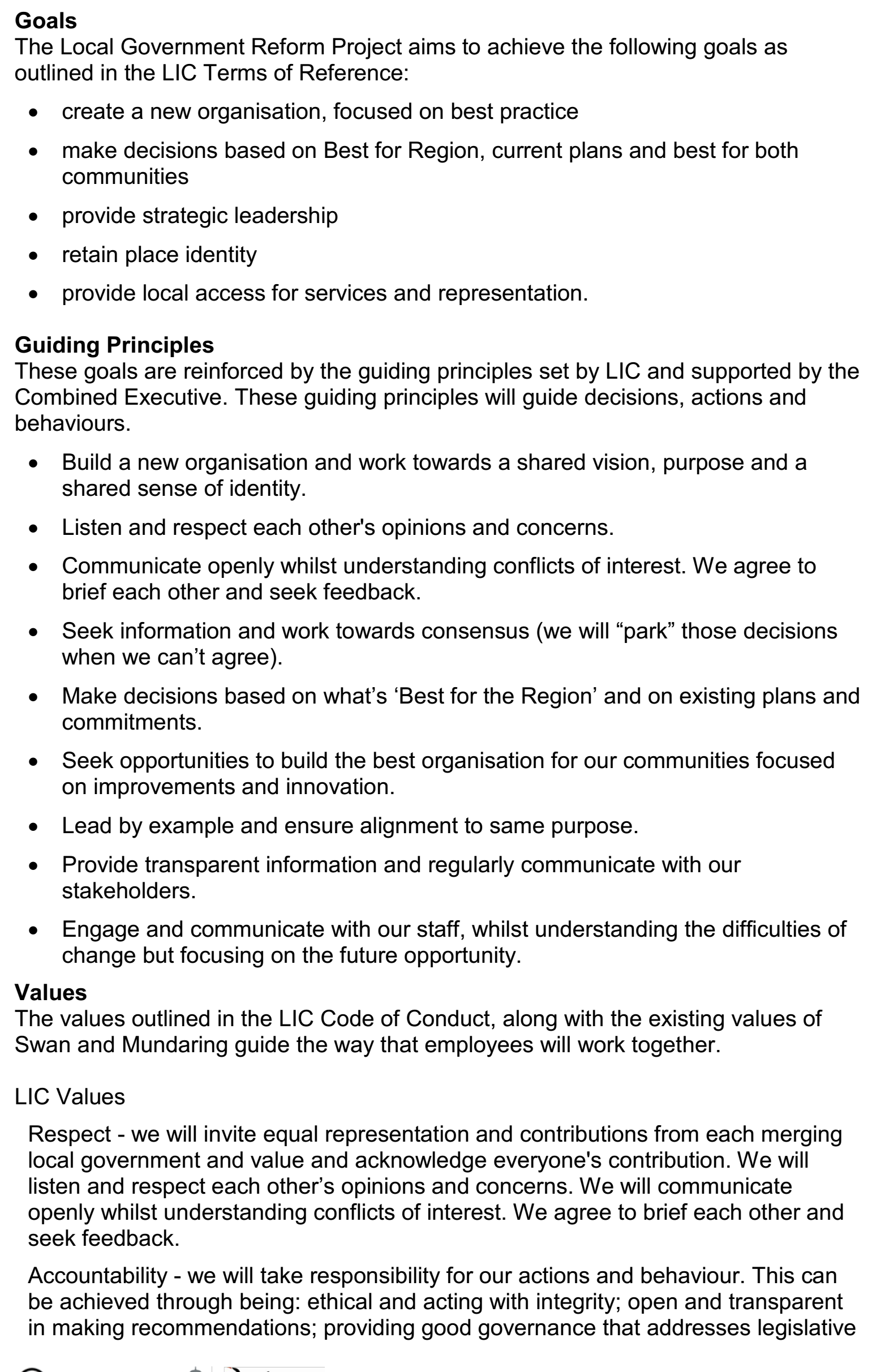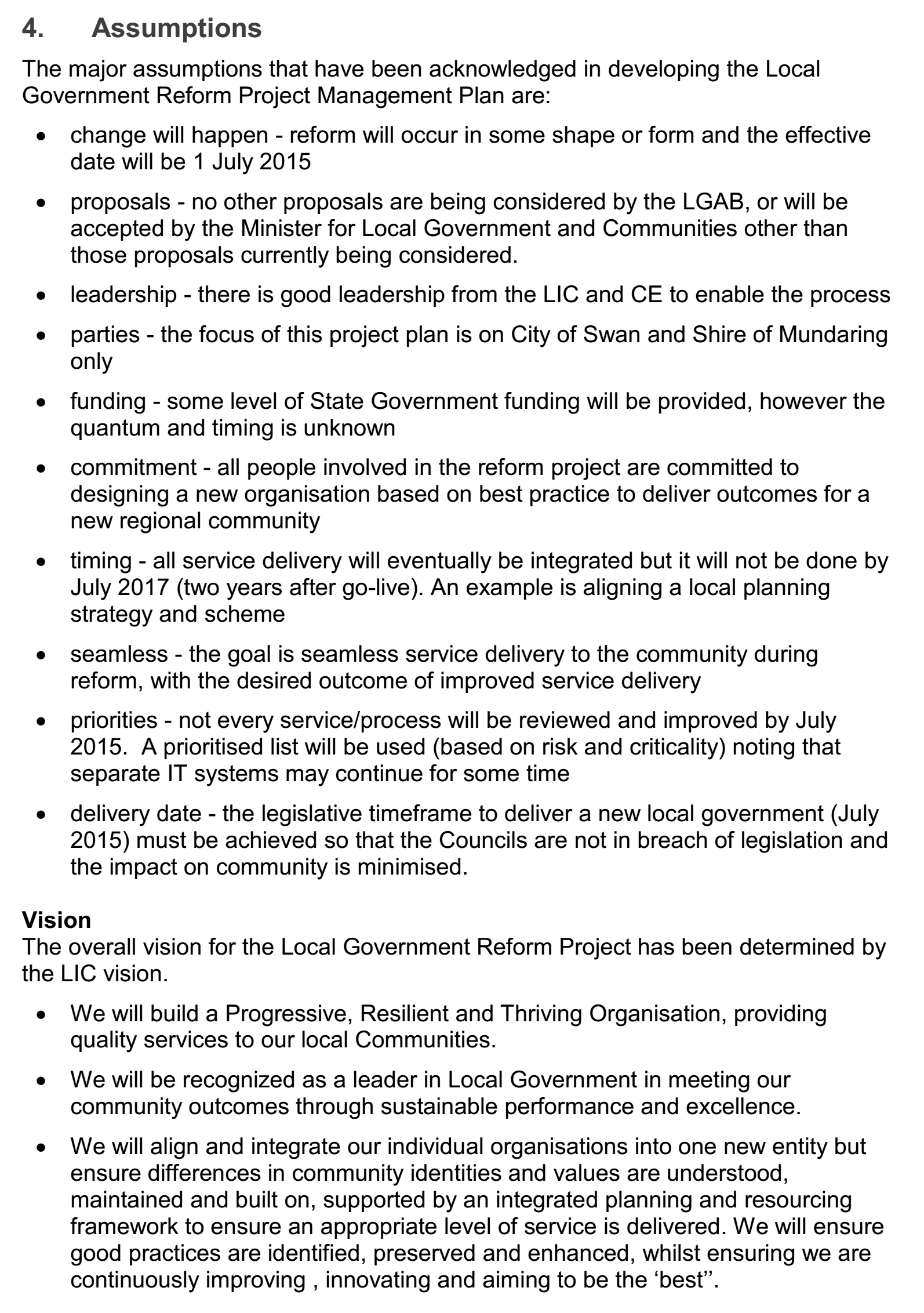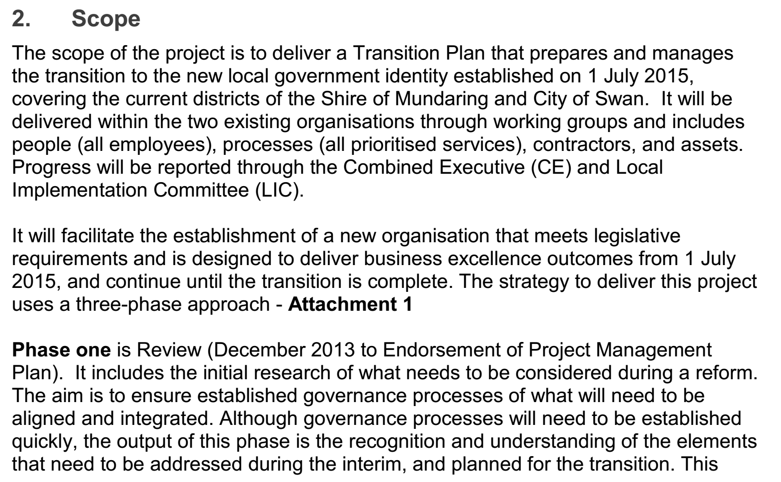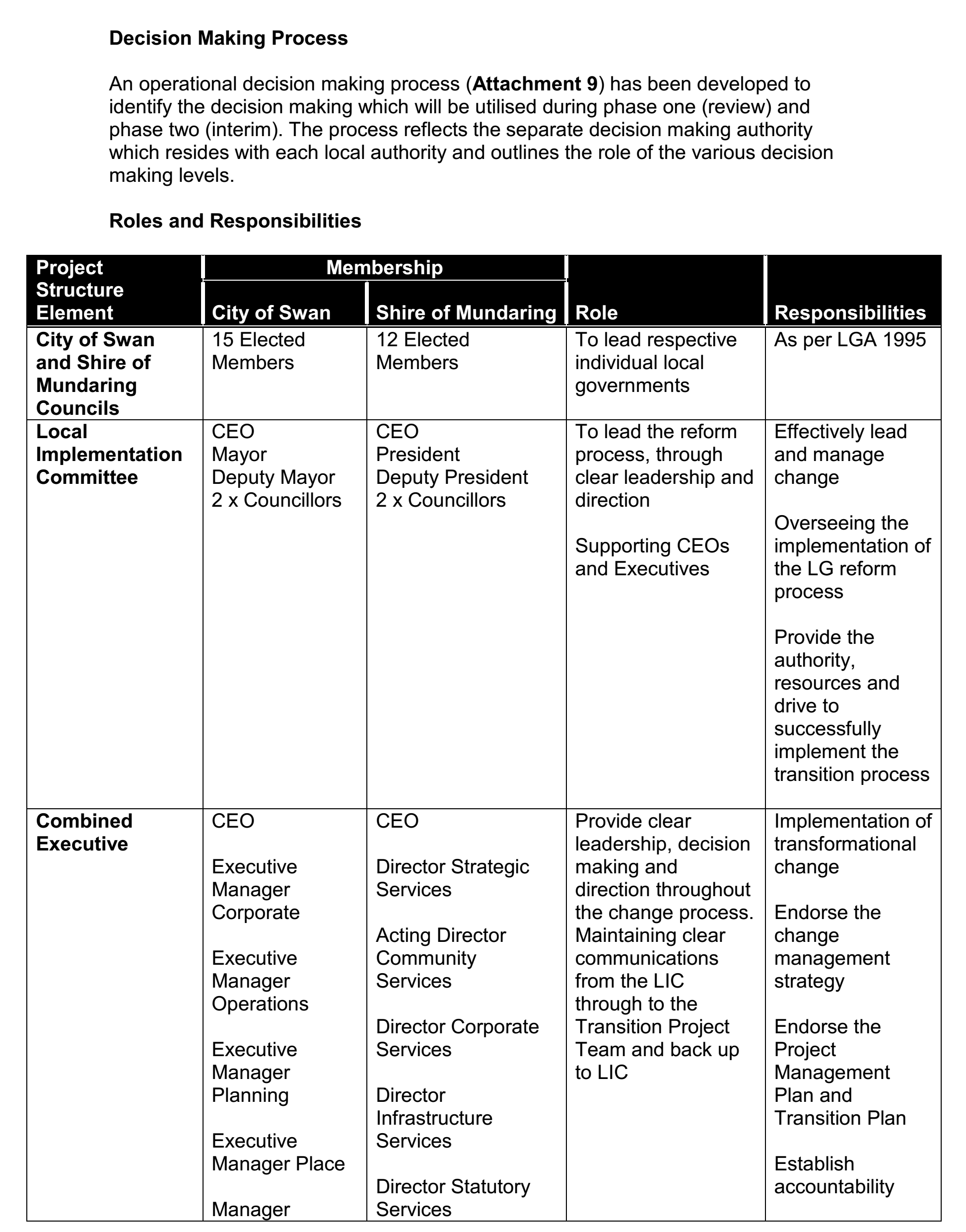 On this background, the PMP under discussion, which is the Swan Mundaring Reform Project Management Plan, is developed to deliver a transition plan that prepares and manages the transition to the new local government identity, convering the current districts of the Shire of Mundaring and City of Swan. This project is delivered within the two existing organizations through working gropus and includes people, processes, contractors and assets. The Combined Executive (CE) and Local Implementation Committee (LIC) are responsible for monitoring the progress of the project.