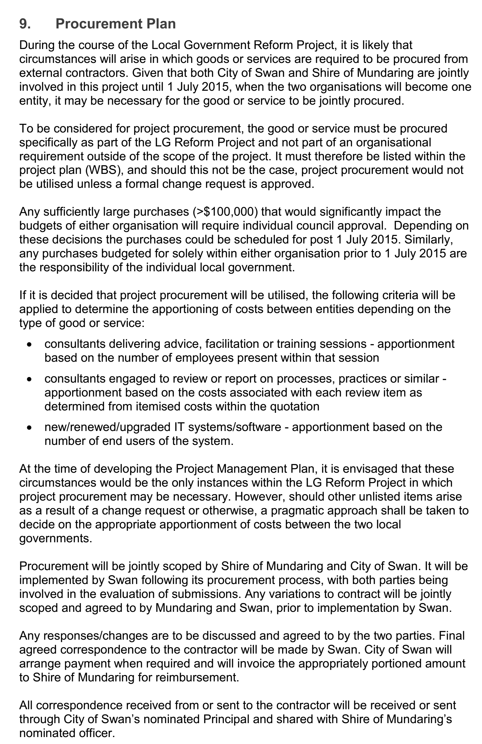 In the chosen PMP, procurement is a significant content addressed by the project team, because the reform of local government boundaries promotes the City of Swan and Shire of Mundaring become one entity. In such a model, some goods and services are necessary to be purchased. To makes sure that budget for all purchases can be fully utilized, in the chosen PMP, a number of criteria is developed and applied to determine the apportioning of costs for different types of goods and services. For example, in terms of the procurement of services from consultant, this PMP regulates that the consultants should deliver advice, facilitations and training programs based on the size of workforce; the consultants should engage in reviewing and reporting on processes, practices and apportionment based on the cost of the required subjects; new or improved systems or software should be provided based on the emerging needs and the number of employees. Additionally, in the PMP under discussion, it is noted that the procurement will be jointly managed by the Shire of Mundaring and City of Swan; both parties are involved in the discussion and decision-making about responses or changes. The above procurement practices suggest that at the planning stage, the chosen PMP considers key steps of procurement management coined by Leach (1999), in particular, determining the procurement requirement. In addition, roles and responsibilities for main stakeholders in the process of procurement management imply that this project adopts an alliance contract in which major parties jointly investigate effective ways to source the required goods and services.