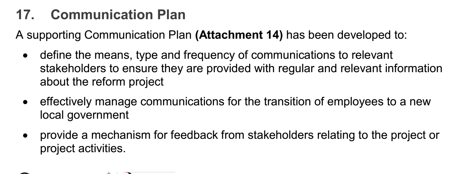 In the chosen PMP, a Communication Plan has been developed for a number of purposes. First and foremost, as is noted in the PMP, the communication plan is created to define the channels, types and frequency of communication relevant to stakeholders, which ensures that they are informed of relevant information about the project. Second, the PMP argues that the project effectively manages communications for the transitions of employees to a new local government. Third, the communication plan builds a mechanism for feedback from stakeholders related to the project and project activities. From these purposes elaborated in the chosen PMP, it is not hard to find that through performing communication management, this project effectively involves primary stakeholders into project activities, creating a platform for them to collaborate.
