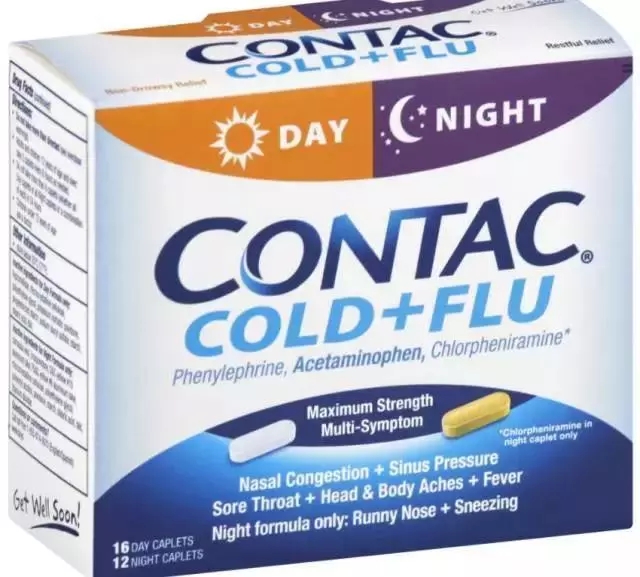 康泰克(Contac),和國內(nèi)的康泰克屬于同種。一盒里面有白天片和黑夜片,針對鼻塞、流鼻涕、流眼淚等癥狀。