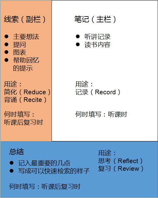o筆記被分為三欄:筆記欄通常在右邊,是左側(cè)的線索欄(副欄)的大小的兩倍。頁(yè)面底部留出五至七條線,或約5厘米,作為總結(jié)欄。