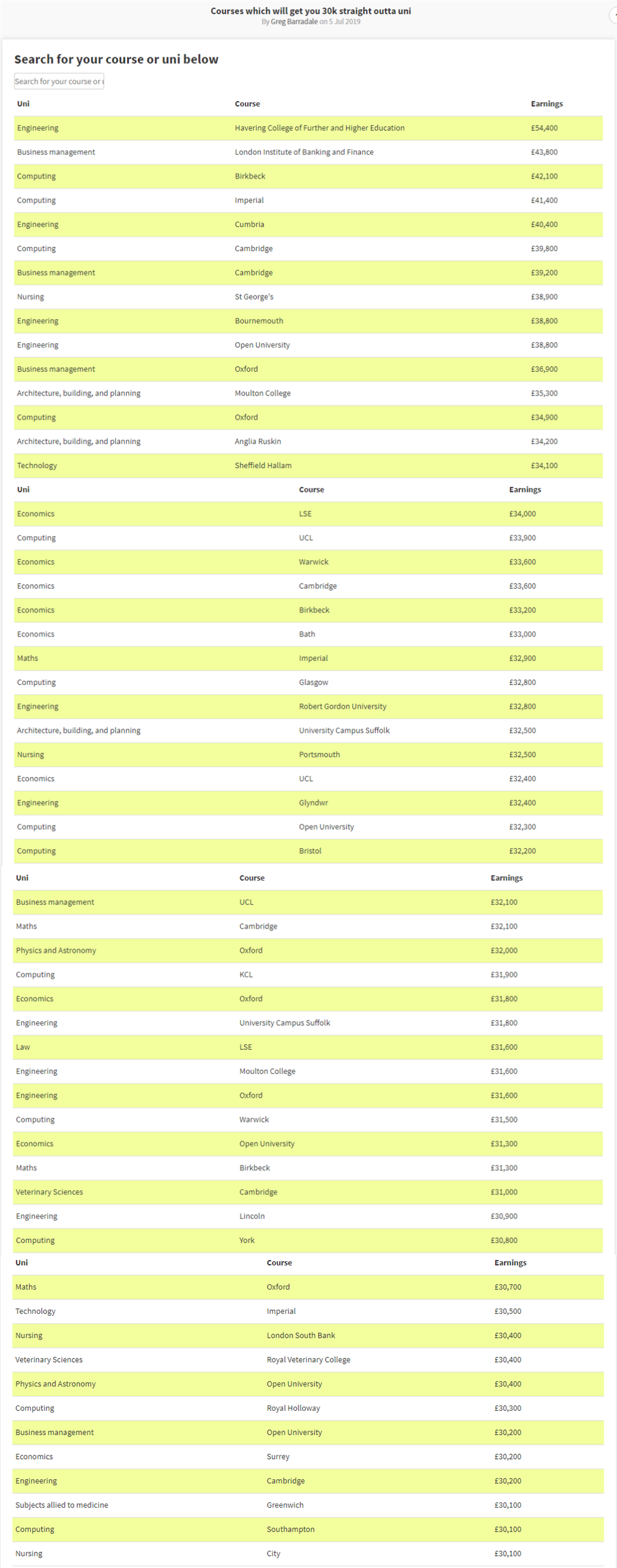 英國(guó)學(xué)生畢業(yè)一年后,年薪中位數(shù)超過(guò)3萬(wàn)英鎊的學(xué)校和專(zhuān)業(yè)盤(pán)點(diǎn)如下:(請(qǐng)放大圖片查看)